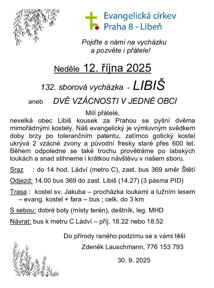 Zveme vás v neděli 12. října 2025 na vycházku do Libiše, kterou povede člen libeňského sboru Zdeněk Lauschmann. Sraz účastníků je do 14 hodin na stanici metra C Ládví, u zastávky autobusu 369 směr Štětí.