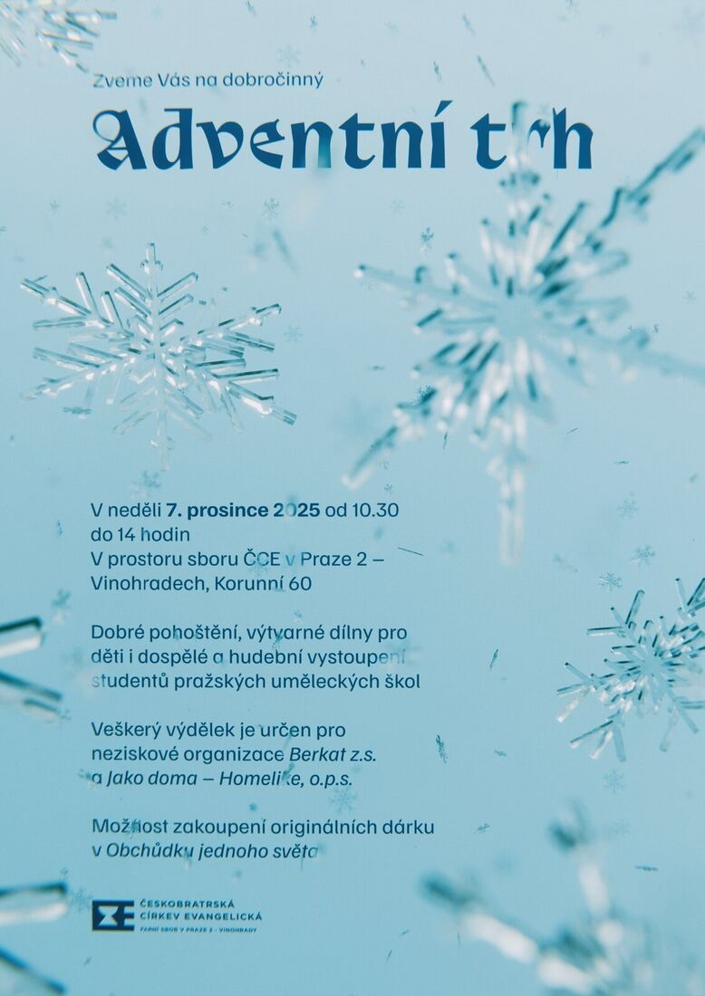 Vinohradští zvou na dobročinný adventní trh v neděli 7.12. od 10:30 do 14 hodin. Pohoštění, výtvarné dílny, hudební vystoupení! Výdělek je určen pro organizace Berkat a Jako doma - homelike.