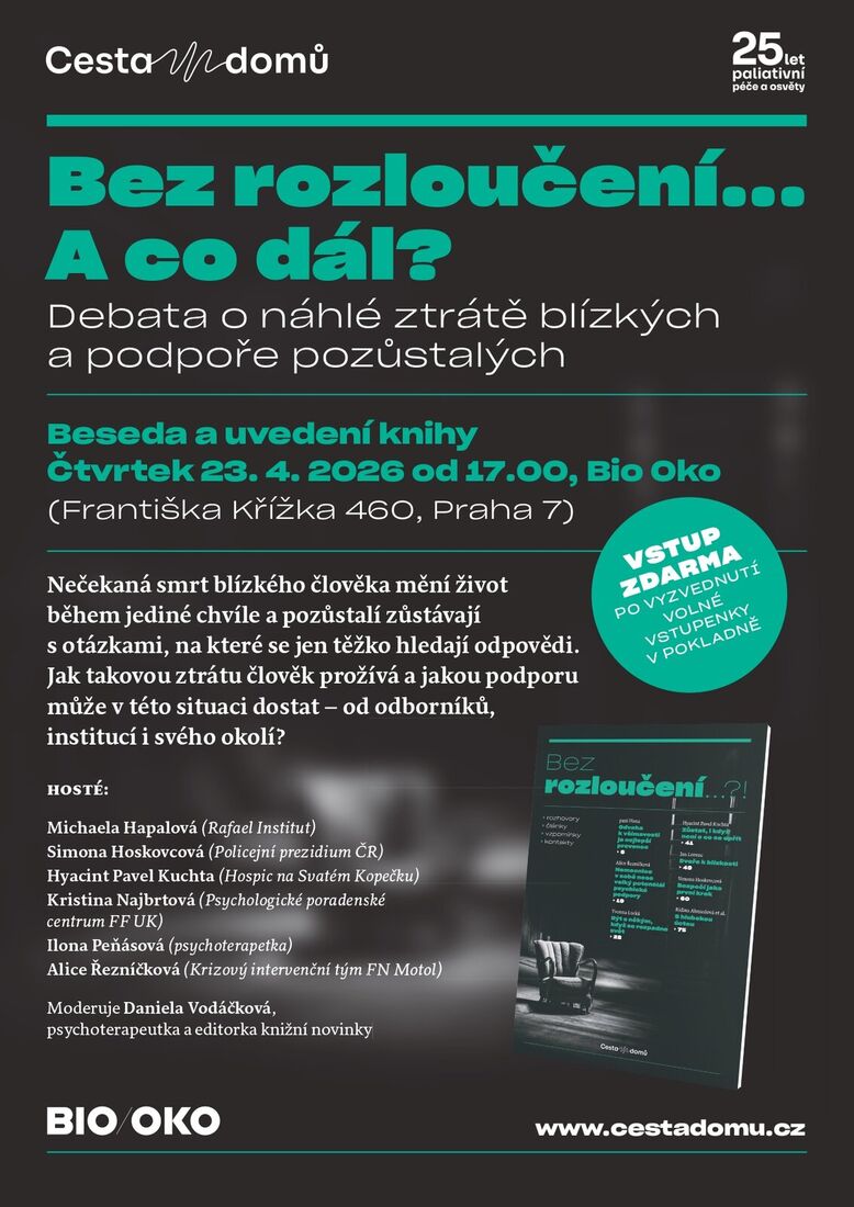 Ve čtvrtek 23. dubna od 17 hodin v Biu Oko pořádá Cesta domů besedu věnovanou náhlým úmrtím blízkého člověka při příležitosti uvedení knižní novinky Bez rozloučení... ?!, která přináší rozhovory s psychoterapeuty, krizovými interventy, psychiatrem, duchovním a dalšími odborníky.