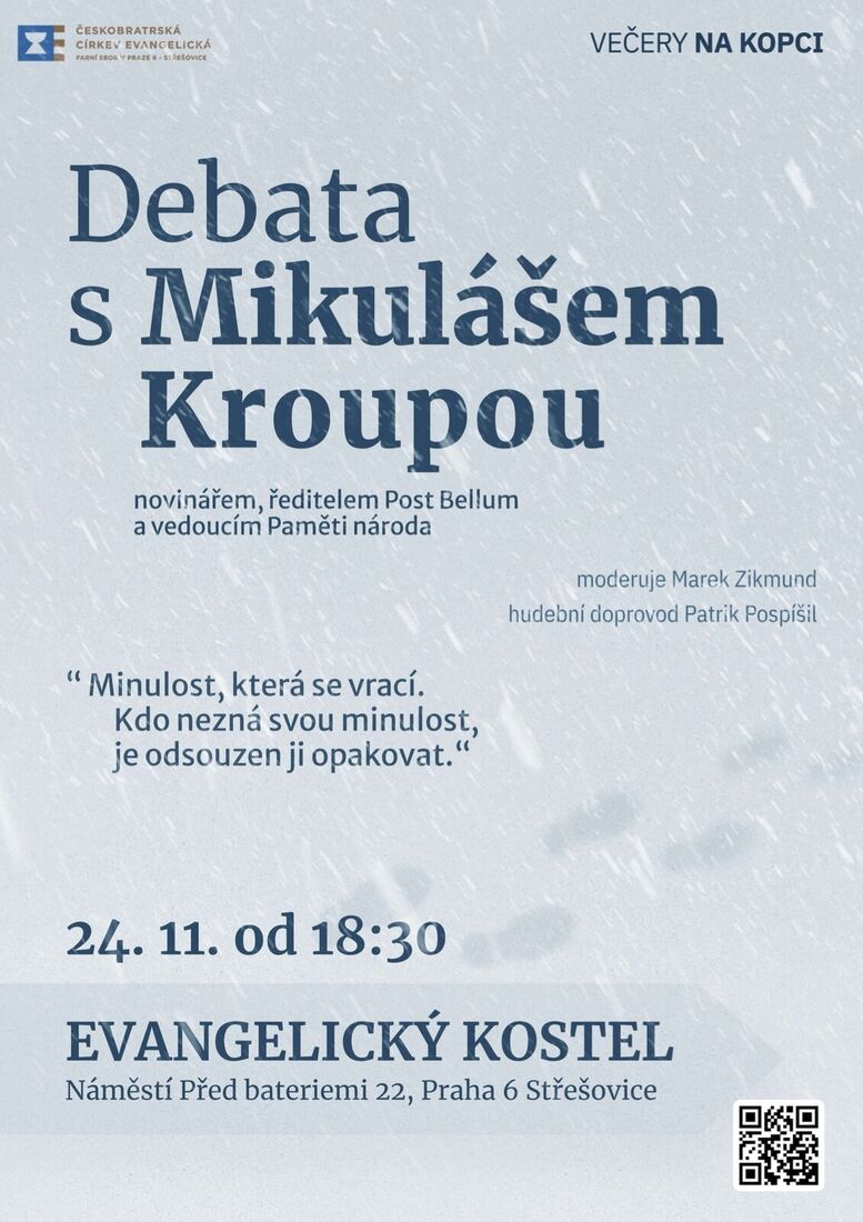 "Minulost, která se vrací. Kdo nezná svou minulost, je odsouzen ji opakovat." Přijďte do Střešovic na debatu s novinářem Mikulášem Kroupou, vedoucím Post Bellum a Paměť národa. V pondělí 24.11. od 18:30 v rámci Večerů na kopci.