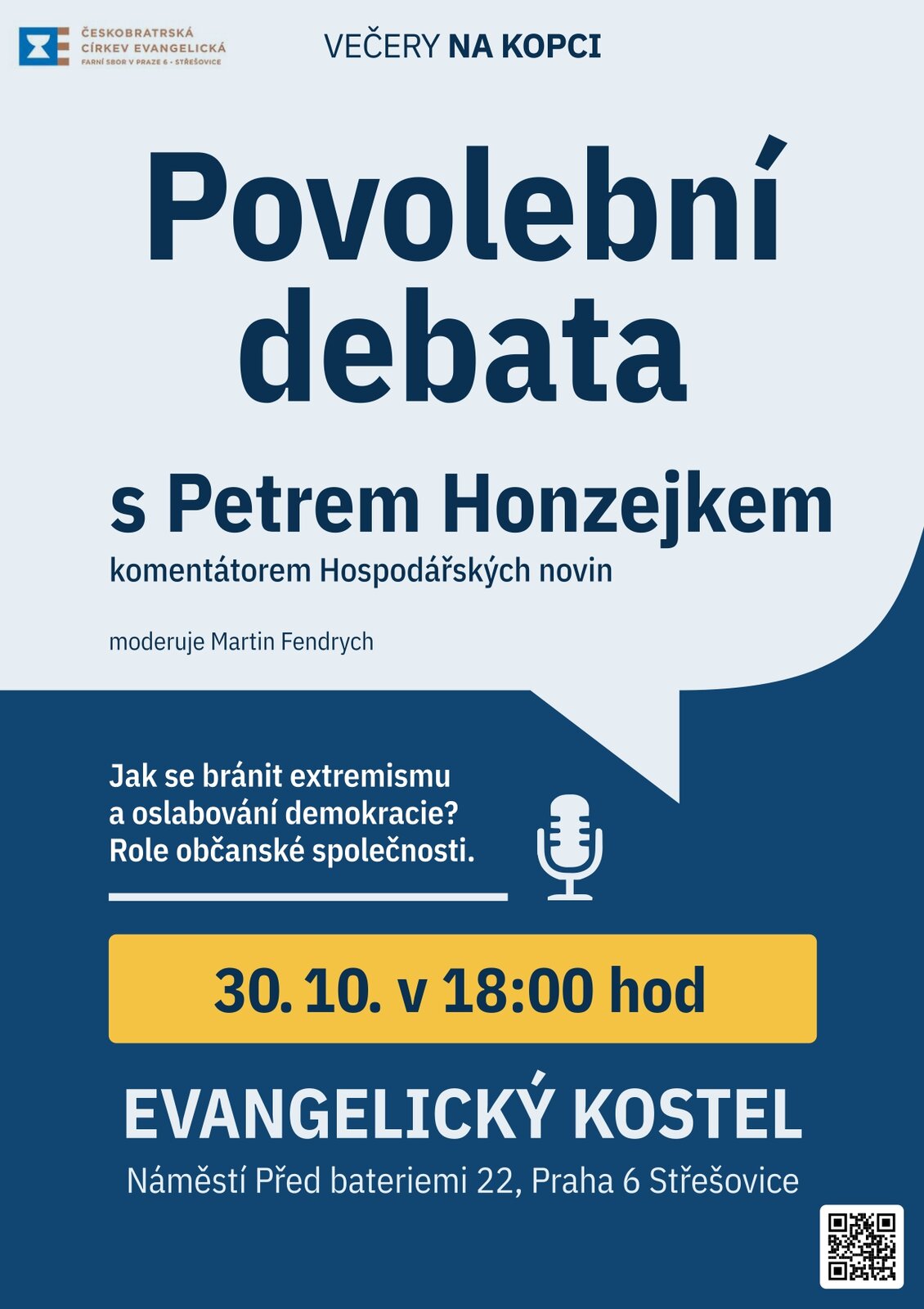 Zveme vás ve čtvrtek 30. října 2025 od 18:00 do sboru ČCE Praha 6 na moderovanou povolební debatu s komentátorem Hospodářských novin Petrem Honzejkem.