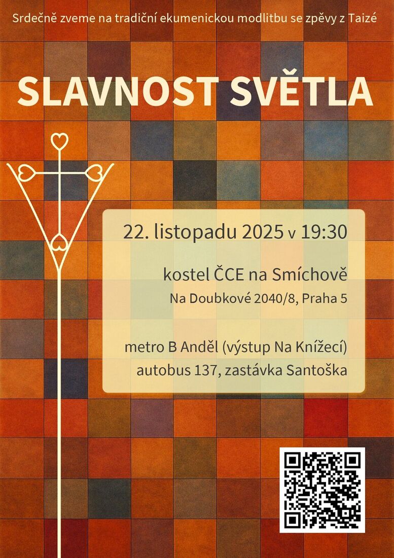 Ekumenická modlitba se zpěvy z Taizé Slavnost světla proběhne v sobotu 22. 11. 2025 od 19:30 ve sboru ČCE na pražském Smíchově. Předpokládaný konec je ve 21:00, po ukončení bude možnost zůstat na společné posezení s drobným občerstvením. Zájemci se mohou od 17:30 do 19:00 účastnit společného sdílení v malé skupině. Netradiční metodou práce s biblickým textem bude bude provázet terapeutka Renata Kolářová. K účasti na sdílení je potřeba se přihlásit prostřednictvím formuláře https://forms.gle/Q4wA8ZUd69KnUBgL8