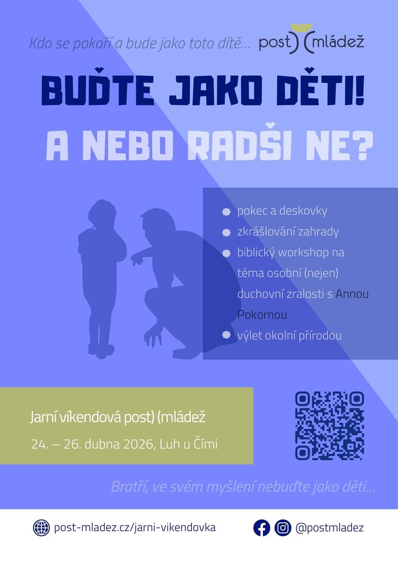 Srdečně zveme odrostlejší mládež (do 35 let) na víkendové setkání Post)(mládeže, které se uskuteční nedaleko Slapské přehrady, v Luhu u Čími. Jedná se o víkend 24.–26. 4. 2026, budeme rádi, když oslovíte potenciální post‑mládežníky, zváni jsou také všichni, kterým dosud nevyšlo navštívit pravidelné čtvrteční setkání Post)(mládeže.