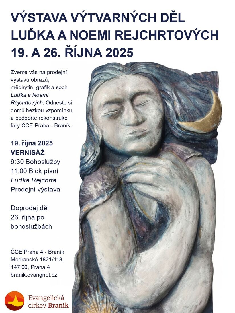Zveme vás na prodejní výstavu obrazů, mědirytin, grafik a soch Luďka a Noemi Rejchrtových. Odneste si domů hezkou vzpomínku a podpořte rekonstrukci fary ČCE Praha - Braník.